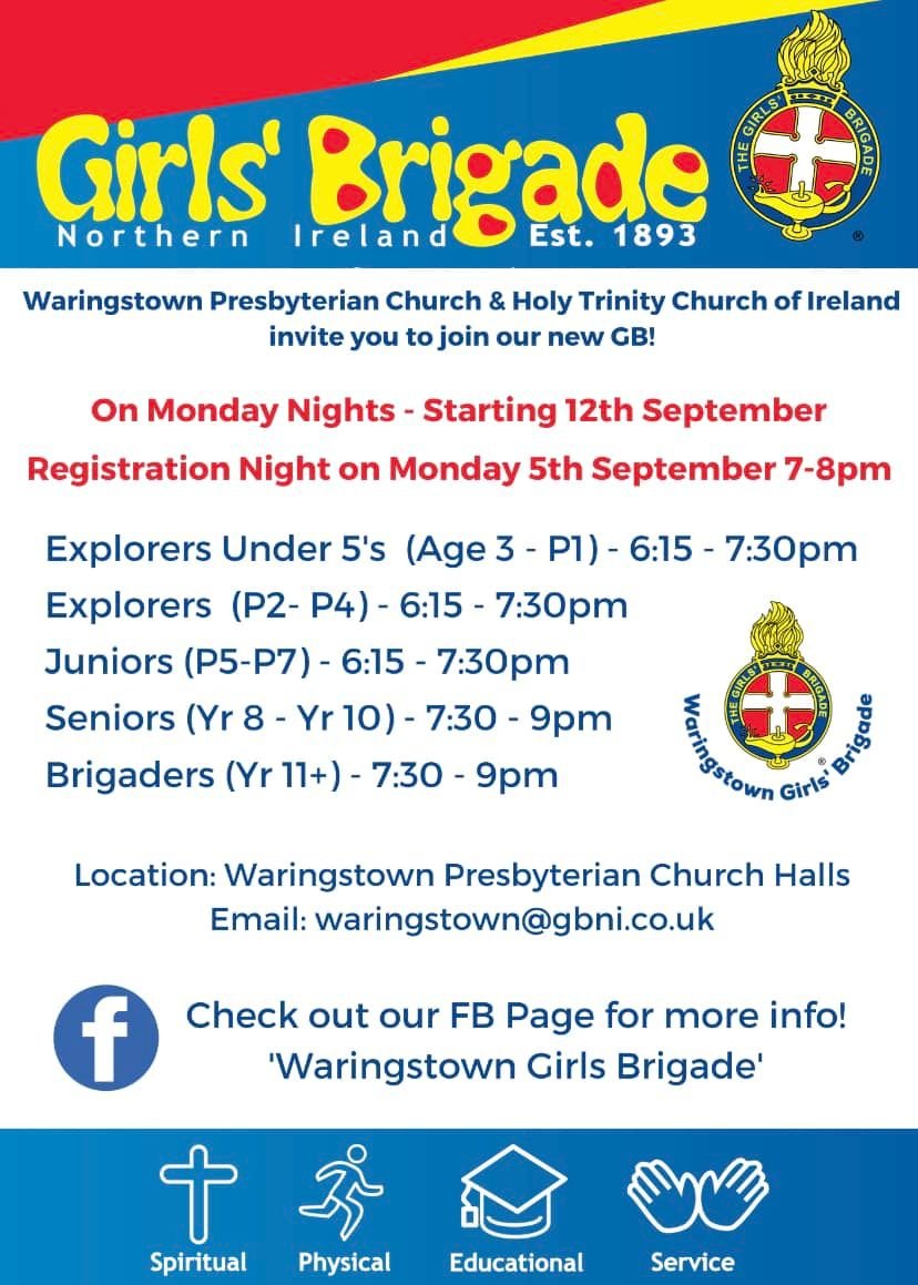 The Select Vestry and the Kirk Session of Waringstown Presbyterian Church are pleased to launch our new joint Girl’s Brigade Company. We want to encourage as many of our girls as possible to be part of this exciting new venture, which ensures that Faith in Jesus Christ is at the centre of all that we do as we aim to Seek, Serve and Follow Christ.